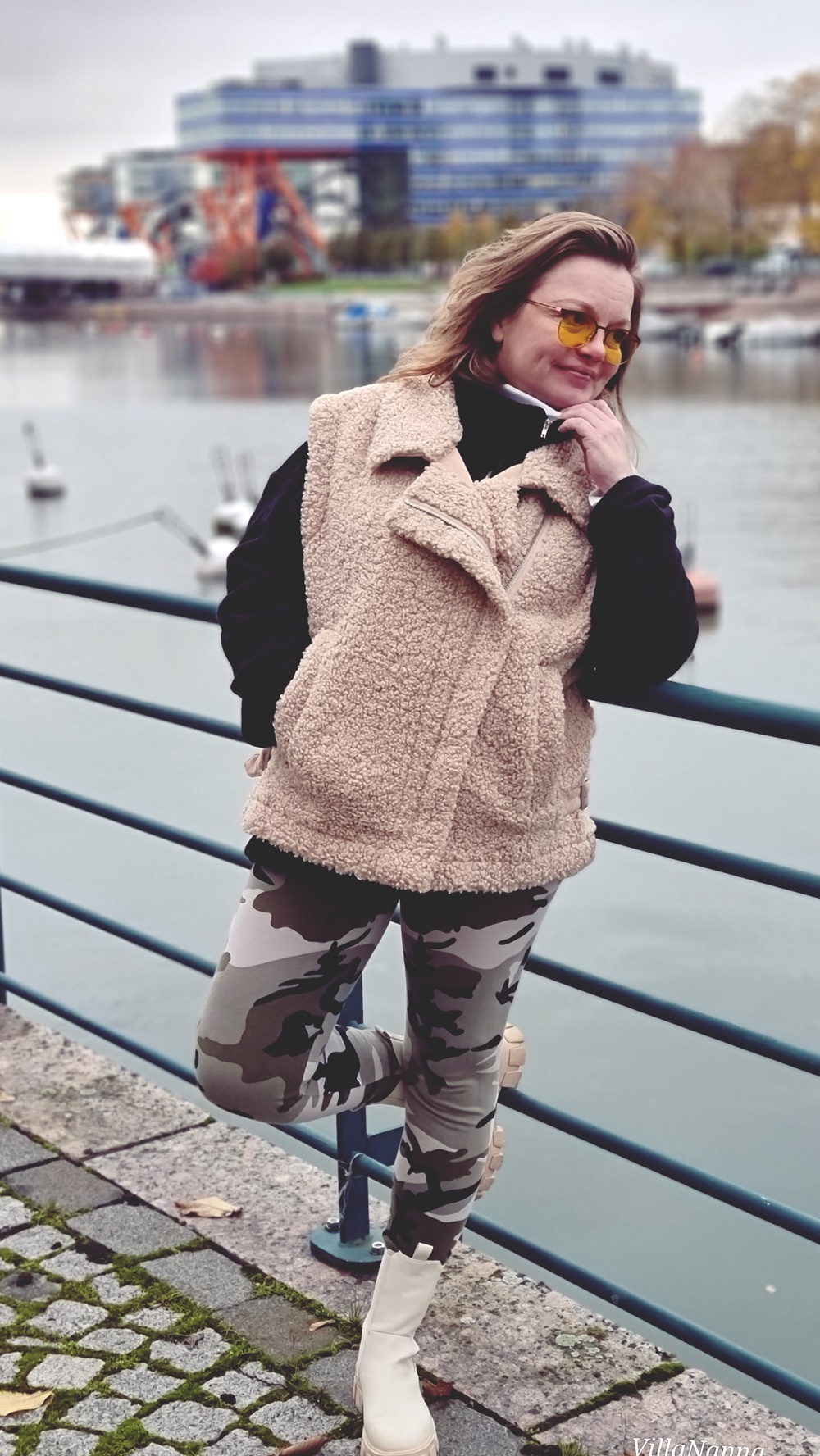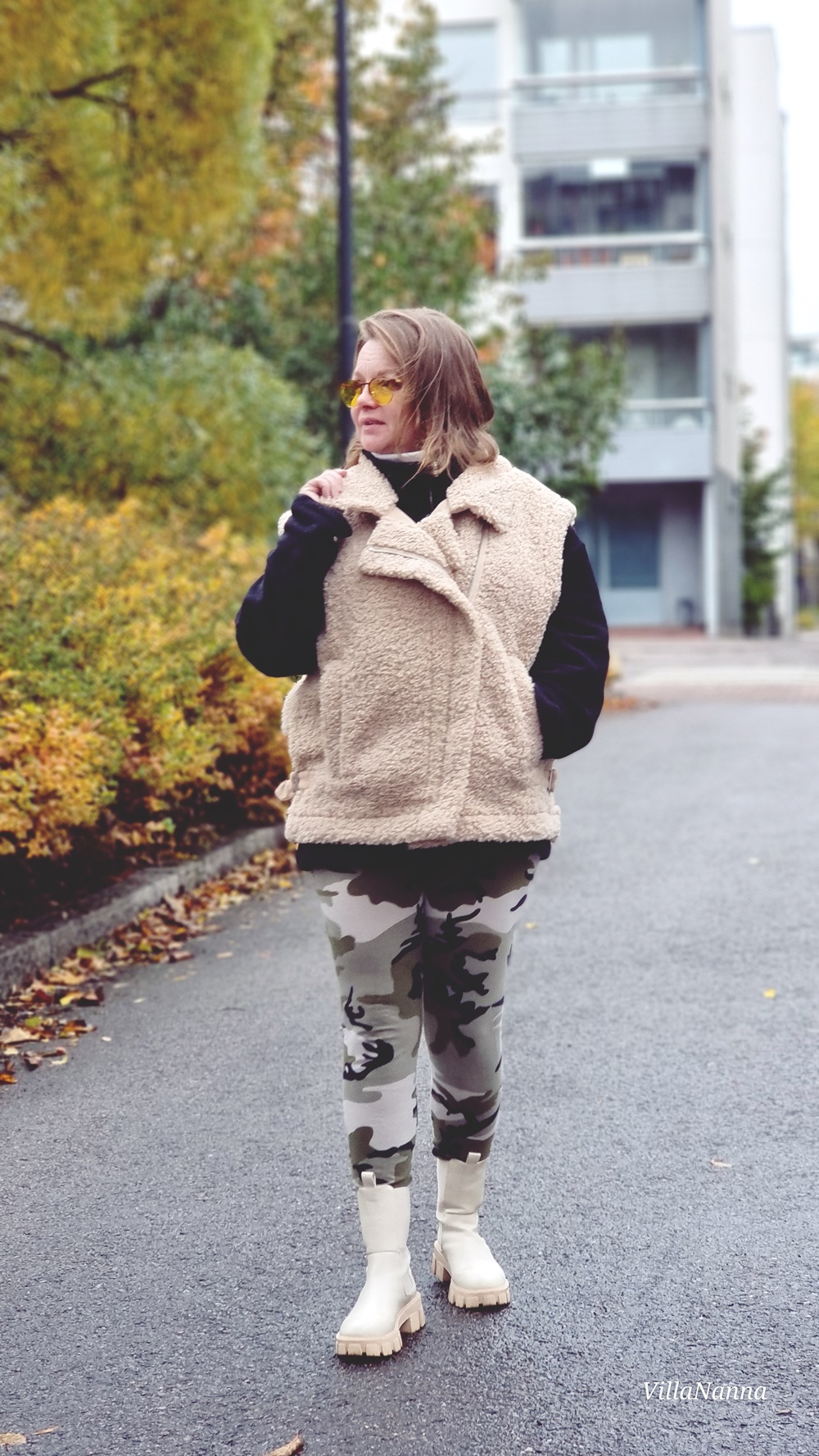 Muutama viikko sitten oli kiva päivä lähteä kävelylle. Aloin rakentaa asuani liivin ympärille. Halusin ehdottomasti tuon ihanan liivin päälleni kun lähdemme kiertämään asuinaluettamme ympäri. Kaivoin siis kaapistani tutun fleecepusakan ja leggarit, molemmat vaatteet olen aikaa sitten tehnyt itse ja ne sopi hyvin liivin kanssa yhteen. Fleecepusakan alle puin kerroksittain kaksi trikoopaitaa, joista toinen oli poolomallia ja jonka olen myös itse tehnyt.