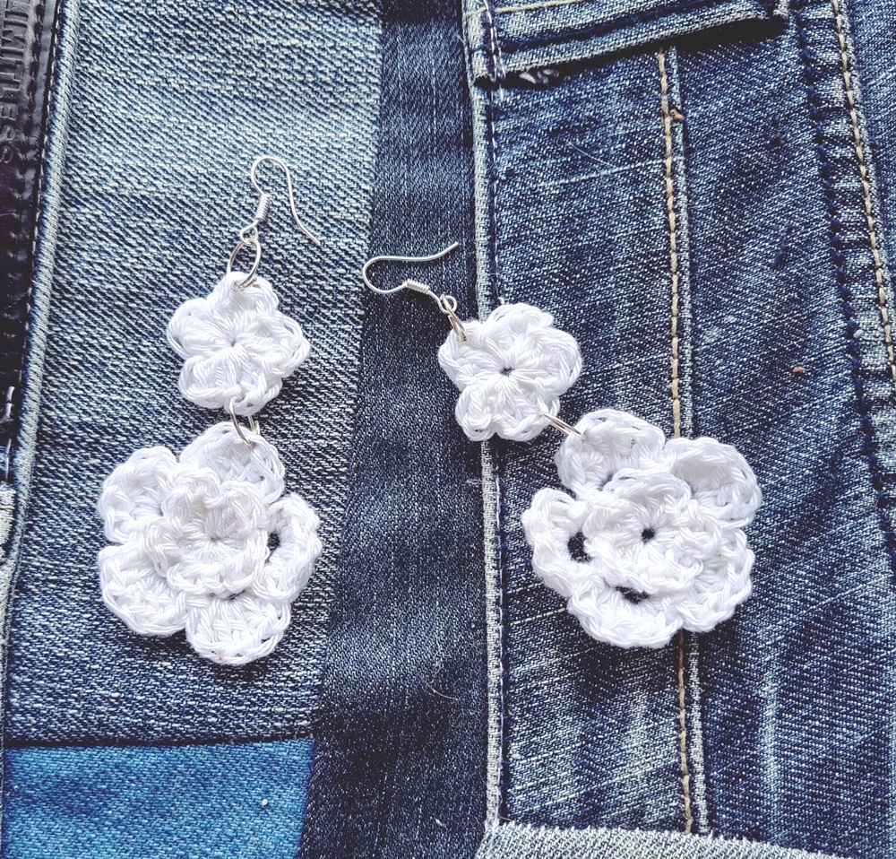 Silloin Yyterin rannalla kun virkkailin jalkakorujani mietin, että näistä kukista tulisi todella suloiset korvikset. Piti aloittaa jo reissulla korviksia mutta se sitten jäi. Ja jäi muutoinkin pitkäksi aikaa ennen kuin lopulta sain väsättyä nämä kolemt korvikset. En oikein osaa valita mitkä näistä olisi kivoimmat, tykkään kaikista ja suunnitteilla on jo toinen satsi. En kohta käytä mitään muita koruja kuin virkattuja.