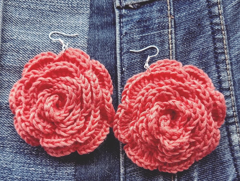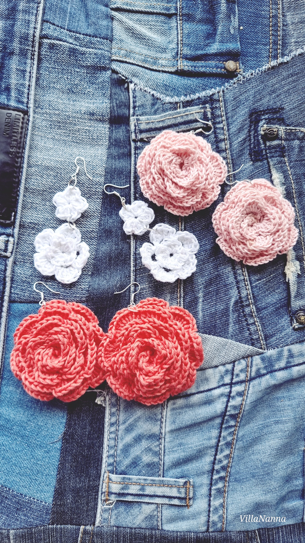 Virkattuja koruja voi tehdä ihan millä mallilla tahansa. Isot korvikset on tehty virkattu ruusuke -ohjeella ja pienet voi tehdä vaikka pikkukukka -ohjeella. Ja tietenkin virkattuja kukkia voi tehdä vaikka millaisia. Nämä ovat vain kaksi ideaa, joista voi lähteä liikkeelle. Kaikki virkatut korut ovat myös kivoja jämälankaprojekteja. Näissä töissä ei mene kovin kauaa, joten näitä tekee hetkessä enemmänkin. Ja vaihtoehtoja on valtavasti mitä kaikkea näilläkin kukilla ja ruusukkeilla voi tehdä.