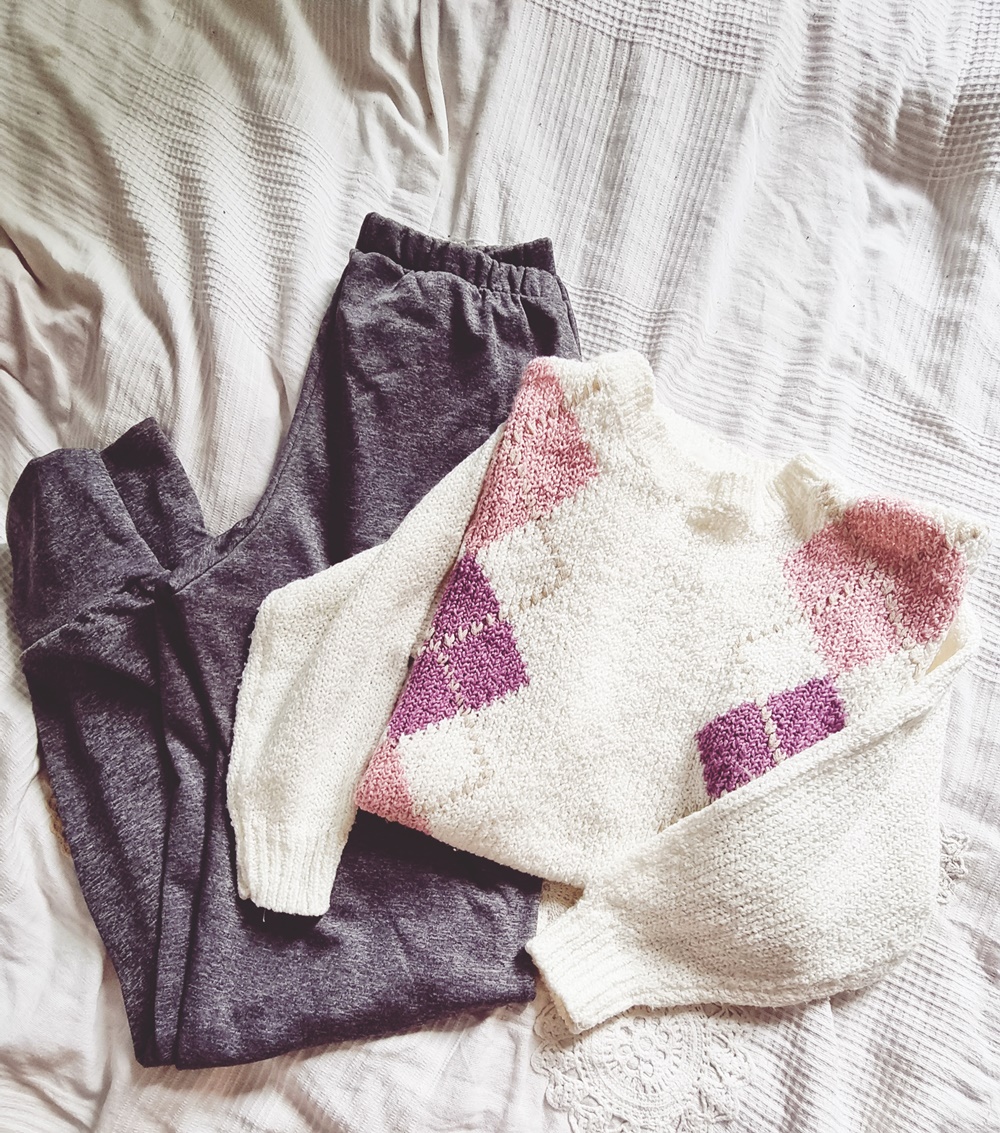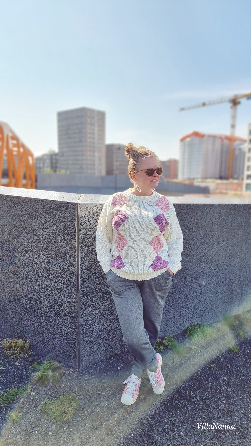 Minun sunnuntain rento asu koostui UFFin suloisesta neuleesta ja itse ommelluista verkkareista. Neule on ihan uusi löytö ja se sopii oikein hyvin tähän välikauteen, kun siirrymme kesästä syksyyn. Sopii toki myös kevään ja kesän välille todella hyvin. Yleensä kuitenkin valitsen farkut tai leggarit neuleen kanssa, mutta nyt halusin kokeilla miten collegehousut sopii ja hienosti menee.