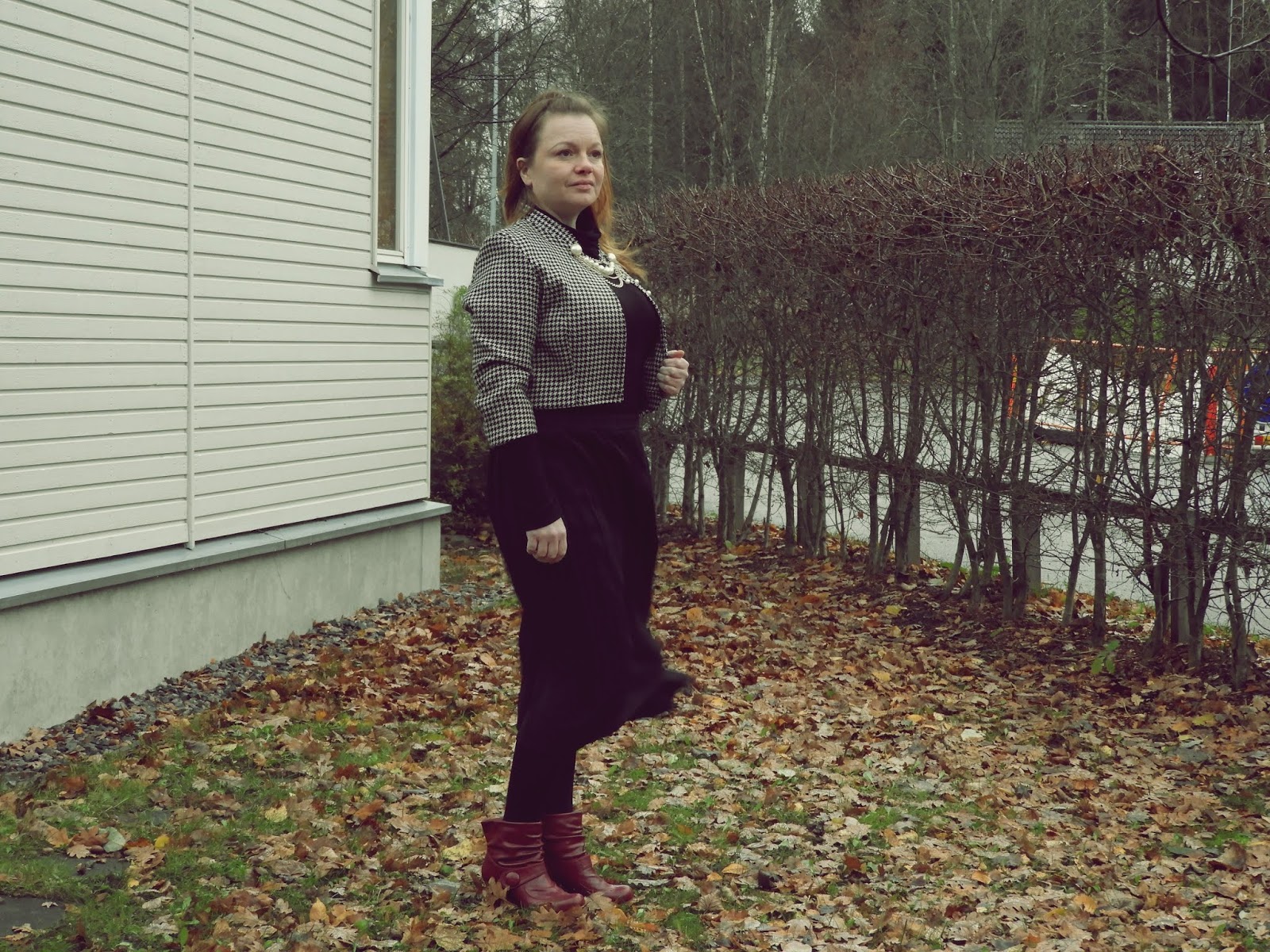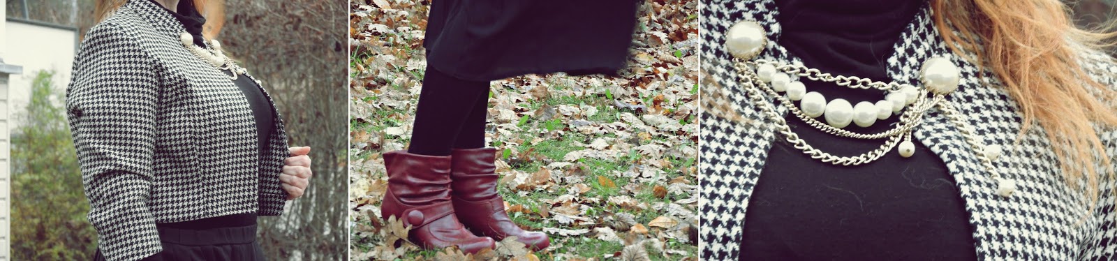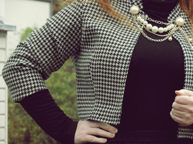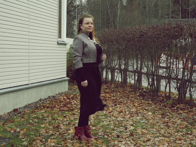 Olen useamminkin täällä kertonut siitä, että rakastan kukonaskel kuviota mutta sen saatavuus kierrätettynä on useasti hiukan hankalaa. Mutta jos saan käsiini tätä ihanuutta, niin kyllä vain nappaan mukaani ja näin tein tuossa aikoinaan kun poikkesin Kierrätyskeskuksen ilmaisosastolla. Laatikossa pilkisti suuren kokoinen bleiseri, joka ei ihan joka kohdasta vuorta ollut enää priimaa. Nappasin sen mukaani ja lopulta bleiseri löysi tiensä Lumppulaatikkoon. Viime keväänä sitten ompelin bleiseristä lyhyen jakun, jota voi käyttää hyvin alkusyksystä tai loppukeväästä.