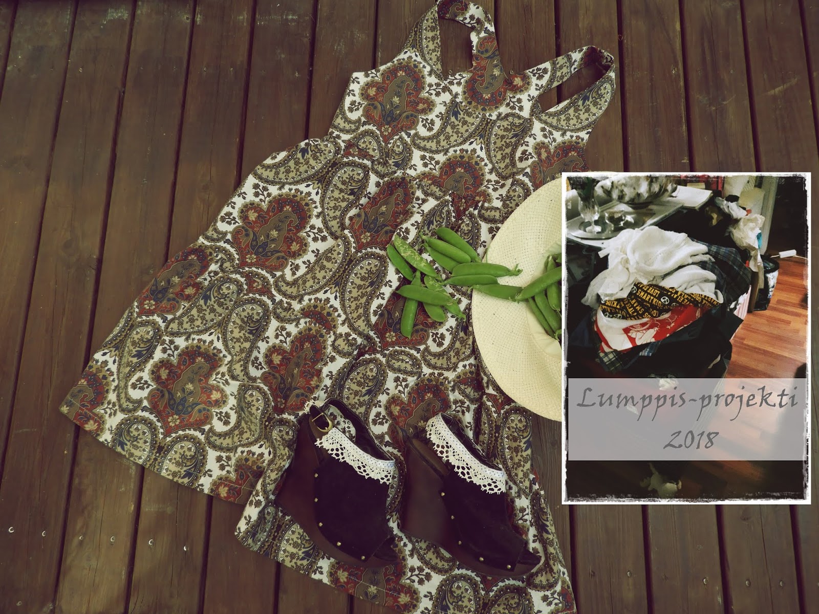 Lumppis-projektin tiimoilta on tehty iso määrä erilaisia juttuja meidän kahdesta vanhasta lakanasta. Lakanat olivat vielä kyllä ihan käyttökelpoiset mutta koska tykkään kuosista todella paljon, niin tein lakanoista tällä kertaa mieluummin vaatteita itselleni kuin lahjoitin ne eteen päin. Lakanoita kun on valtavasti mennytkin Hope- yhdistykselle mutta nämä eivät menneet. Valitettavasti en ole kuvannut mekkoa itseni päällä, enkä myöskään nuken päällä mutta koska kyseistä mekkoa on tehty ennenkin niin kuvia löytyy kyllä, esimerkiksi täältä.