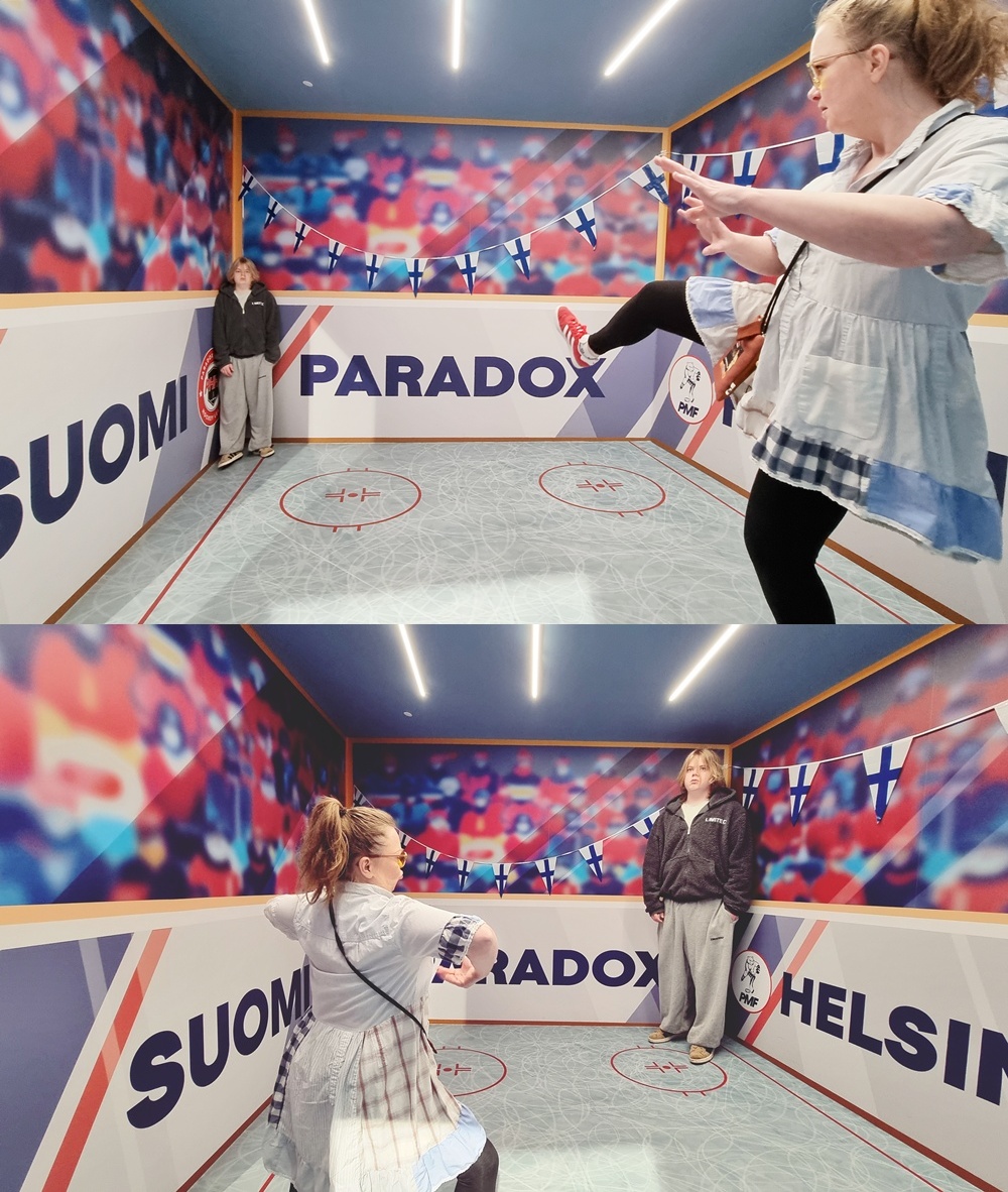Perheemme 16-vuotias seisoi jo sisäänkäynnillä kuin kivipatsas. Hän ei sanonut mitään, mutta ilme kertoi kaiken: “Tämä on kiusallista.” Hän kulki mukana kuin ohjelmoitu robotti, ei nauranut, ei koskenut mihinkään, ei ottanut kuvia. Me mieheni kanssa puolestaan koimme suurta riemua. Siis ei pelkästään Paradox museosta, vaan siitä, että teinimme häpesi meitä niin sydämensä pohjasta. Me teimme kierroksesta näyttävän: heittäydyimme joka kuvaan, makasimme illuusiohuoneiden lattioilla, seisoin seinillä ja mieheni ”kellui” katossa. Kuvasimme toisiamme, mutta kaikkein arvokkainta oli se vilpitön nauru, joka kumpusi vatsanpohjasta.