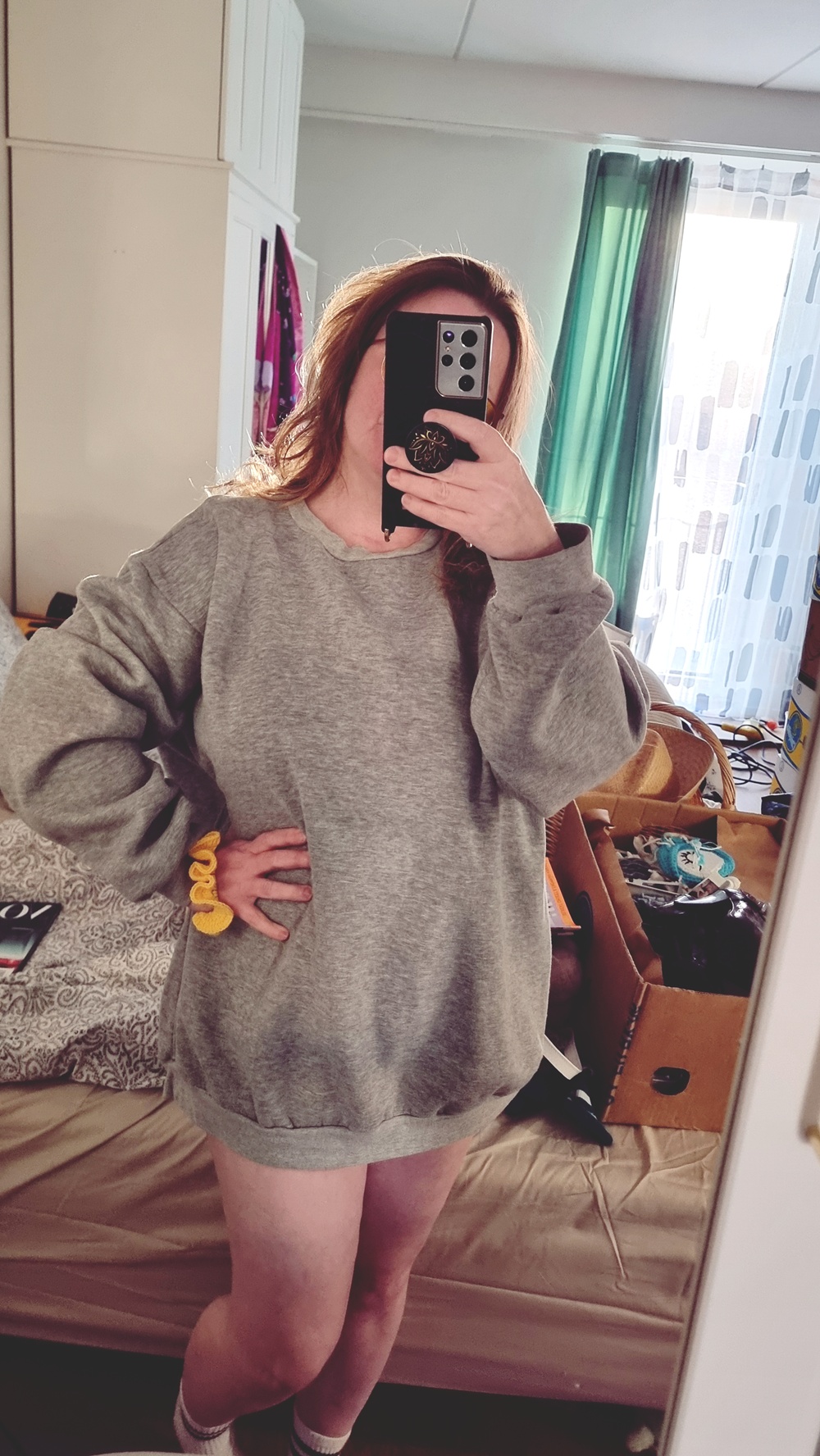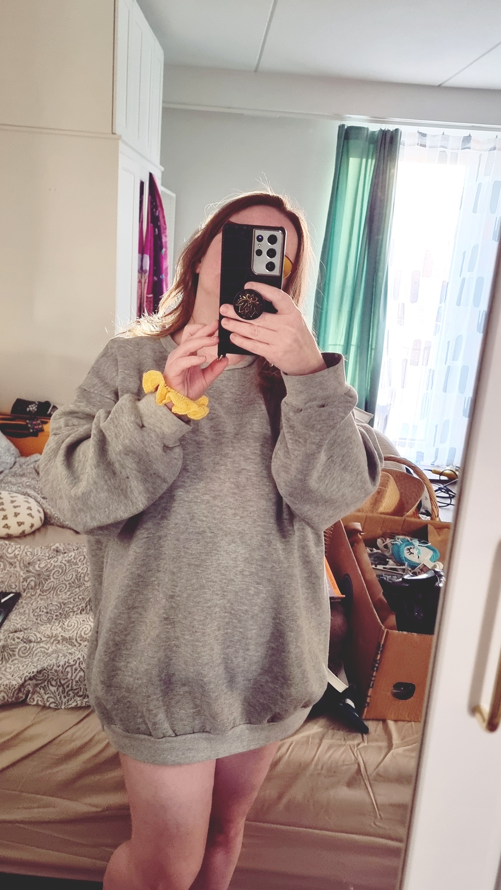 Päälläni on harmaa collegepaita*. Se ei ole mikä tahansa vaate, vaan nuorimman poikani tekemä. Lahja, joka lämmittää enemmän kuin mikään villatakki voisi. Se muistuttaa minua rakkaudesta, käsillä tekemisestä ja siitä, kuinka suuria asioita pieniin pyykkikoreihin voikaan piiloutua. Hihaani koristaa keltainen virkattu hiusdonitsi, omien käsieni jälki. Se on pieni ilon pilkahdus, väriä arkeen, ja samalla todiste siitä, että vaikka elämä välillä väsyttää, luovuus ei katoa.