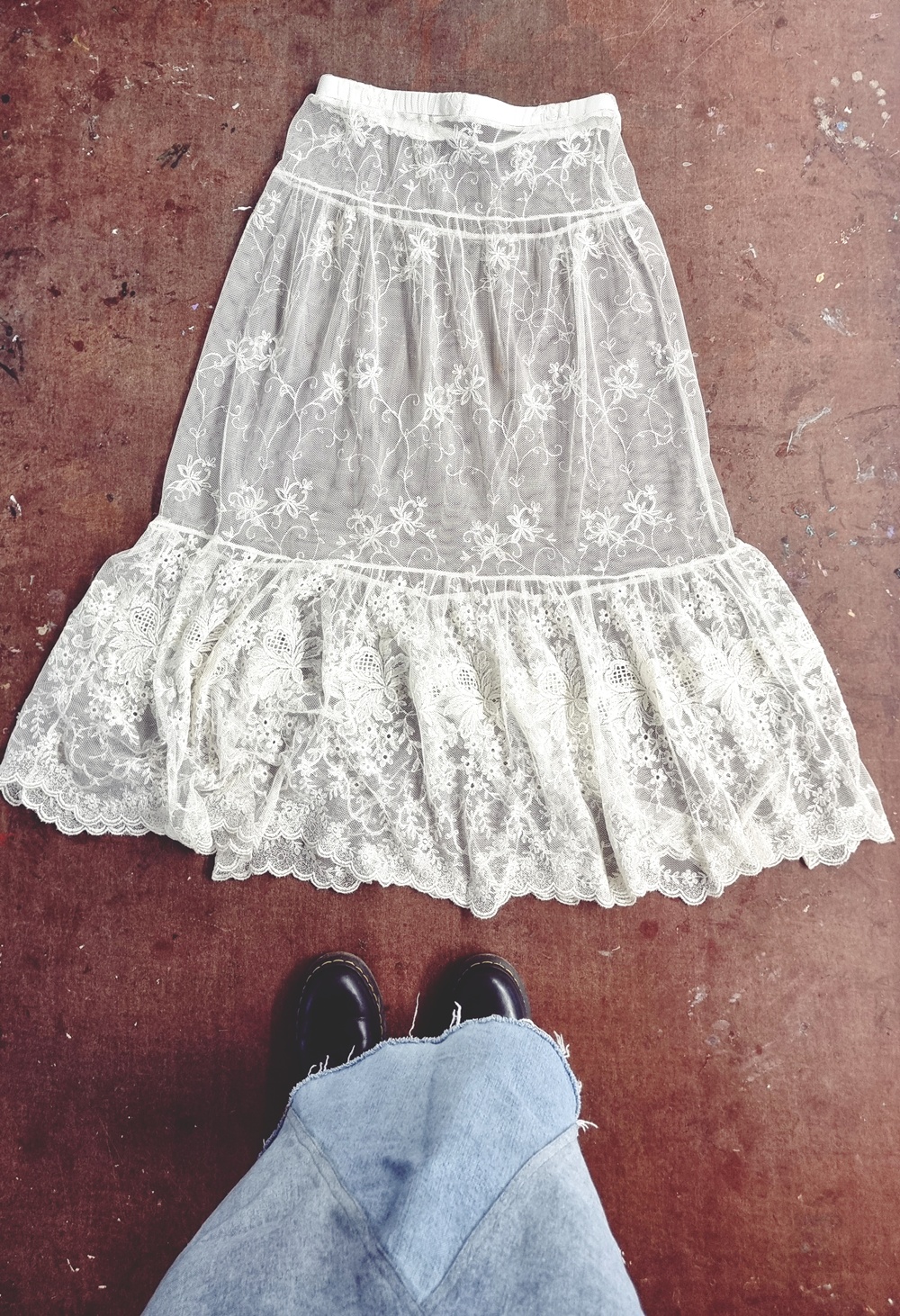 Päälläni hulmuava pitsihame ei ole kaupasta ostettu, se on joskus ollut pitsiverho. Kevyt, herkkä ja romanttinen kangas sai uuden elämän ompelupöydälläni. En halunnut sen tarinan päättyvän ikkunaan, kun siitä saattoi tulla jotain vielä kauniimpaa.
