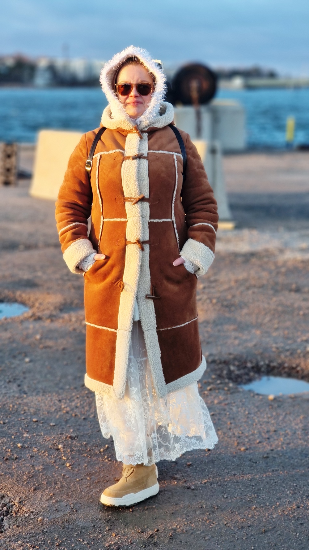 Talvituuli puraisee poskia Jätkäsaaressa, mutta sydämessä läikähtää lämmin ylpeys siitä, että päälläni on tarinoita, ei vain vaatteita. Vanha pitsiverho muuttui unelmien hameeksi, Kierrätyskeskuksen neule lämmittää muistoineen, Fidasta löytynyt talvitakki kietoo minut turvaan, ja jämälangoista virkattu hattu on kuin villainen halaus, jonka tein itselleni. Tämä kokonaisuus päällä tuntui kuin olisi astunut omaan satuun, paikkaan, jossa ekologisuus ja estetiikka kohtaavat, ja jossa jokainen kerros kertoo: Talvinen kierrätysmuotiasu – romanttinen pitsihame, lämmin lammastakki ja jämälangoista virkattu hattu luovat unelman Jätkäsaaren tuuliin.