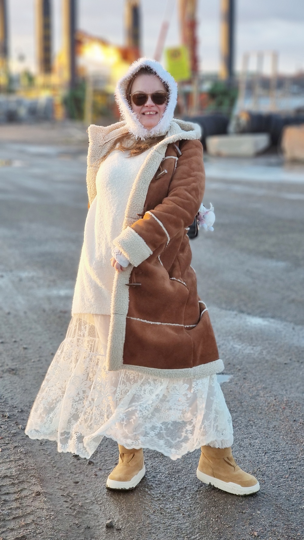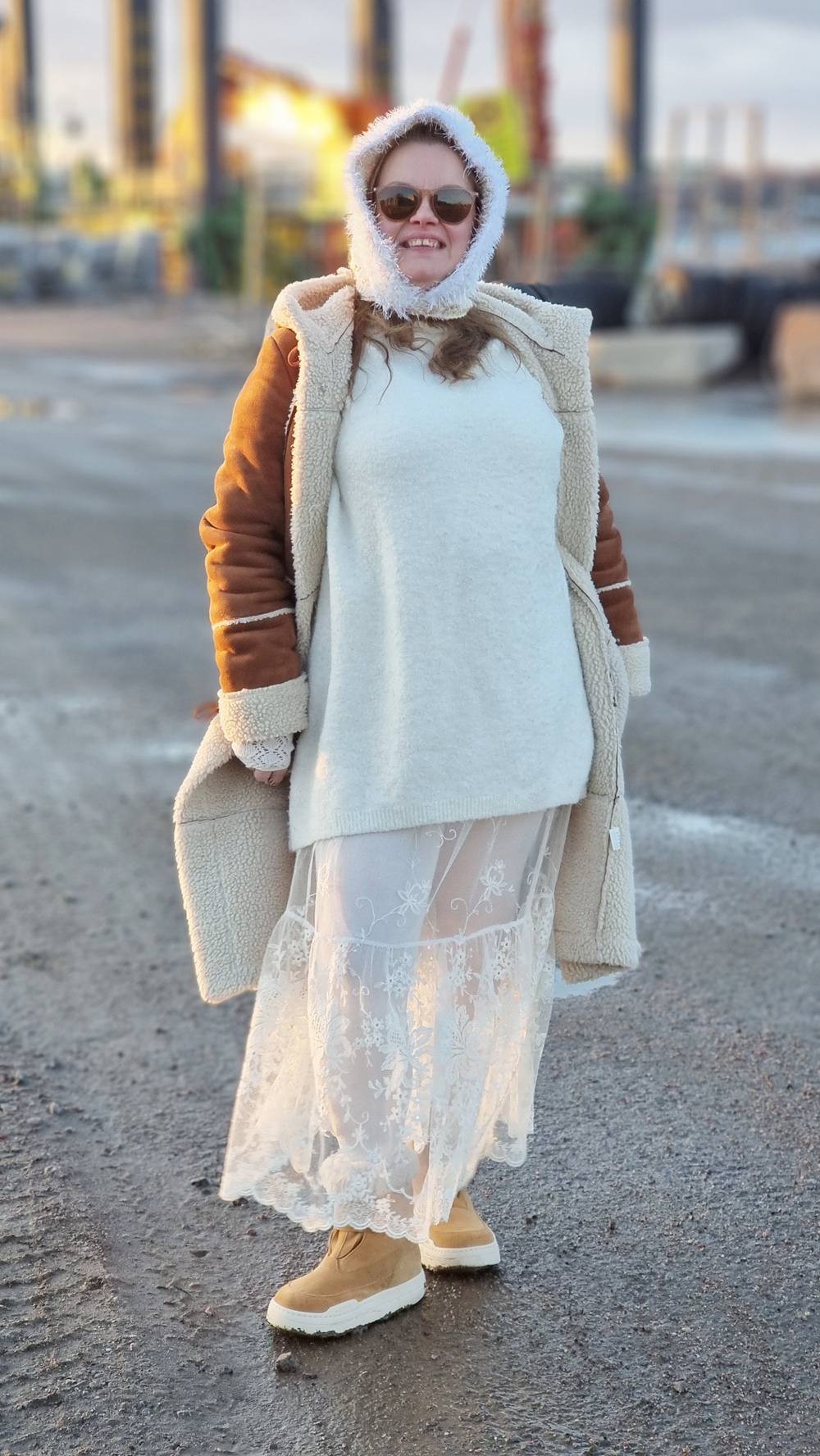 Talvinen kierrätysmuotiasu – romanttinen pitsihame, lämmin lammastakki ja jämälangoista virkattu hattu luovat unelman Jätkäsaaren tuuliin
