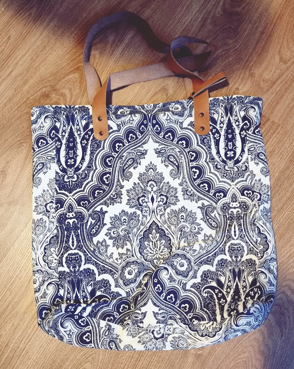 Se seisoi ovenpielessä, tuttu kangaskassi, joka oli nähnyt enemmän kuin moni ihminen. Se oli kantanut kangaskaupan löytöjä, kulkenut torilta kotiin omenien ja yrttien tuoksussa, ja istunut kesäpäivinä aurinkotuolin vieressä kuin uskollinen ystävä. Mutta nyt… sen reuna oli ratkennut. Kahvat repsottivat kuin väsyneet kädet, ja kankaan kuvio näytti hengittävän menneiden aikojen sinivalkoista tarinaa.