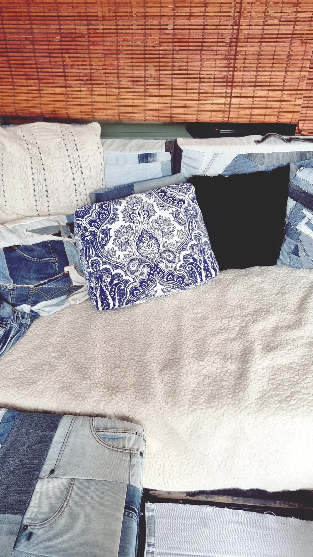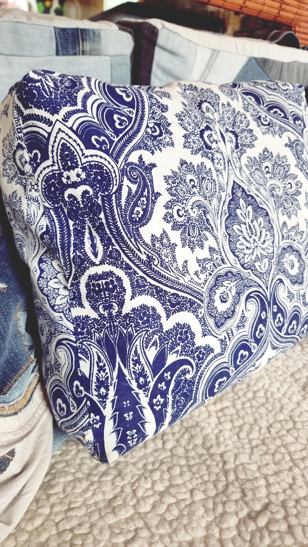 Toinen etappi: uudestisyntyminen. Kun painoin sormeni kankaaseen, tunsin sen puhuvan. Se halusi jäädä parvekkeelle, sinne, missä meri näkyy juuri sopivasti ja aurinko osuu iltaisin täydellisesti kukkaruukkujen lomaan. Syntyi idea: tyyny. Ei mikä tahansa tyyny, vaan kassi, joka ei suostunut katoamaan hiljaa.