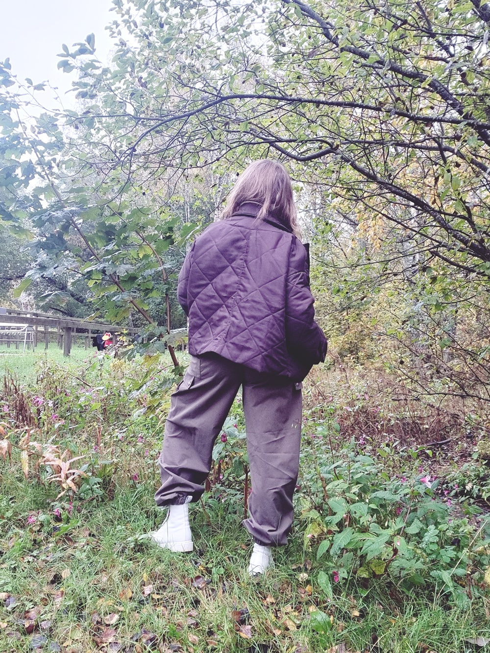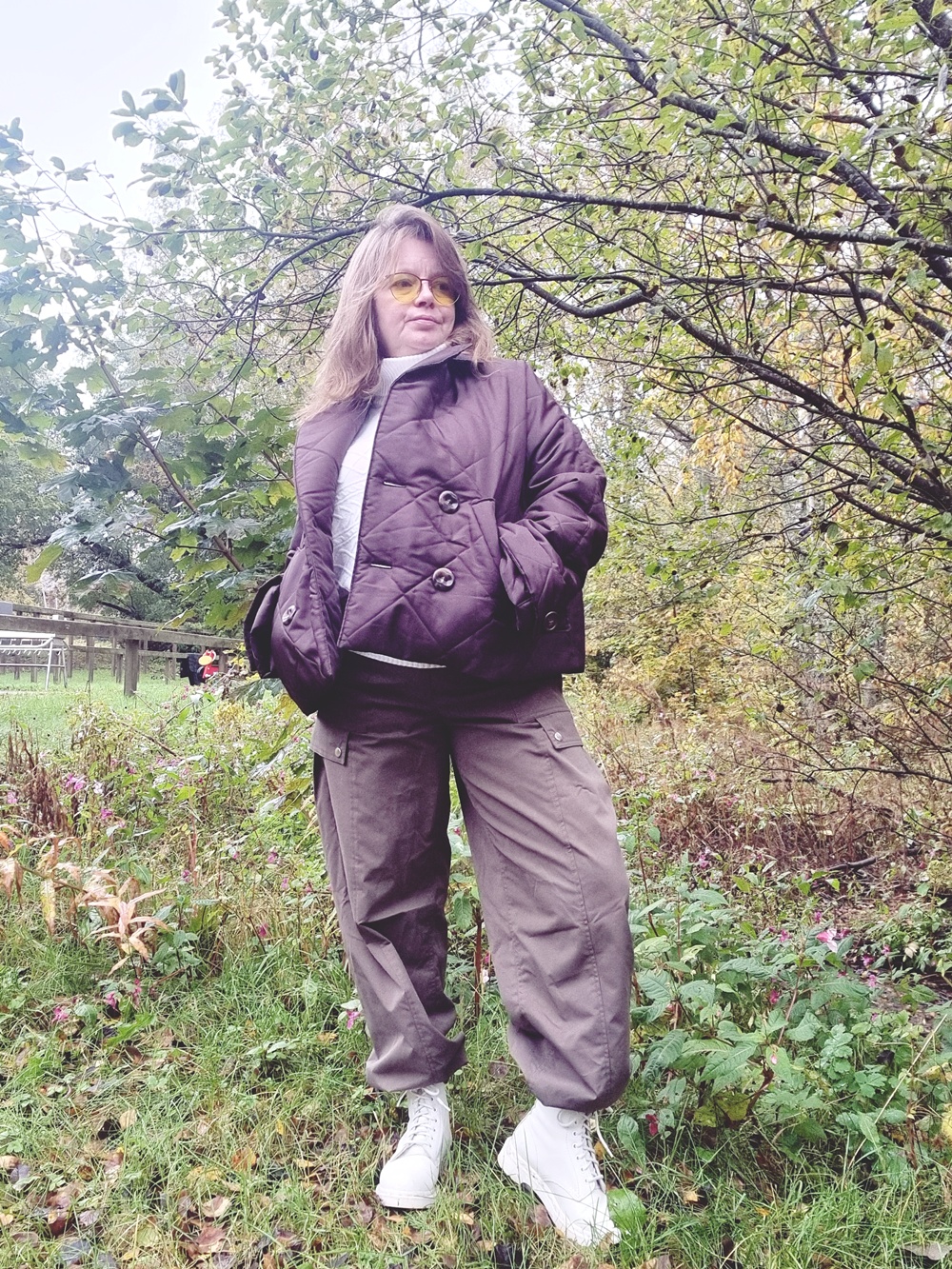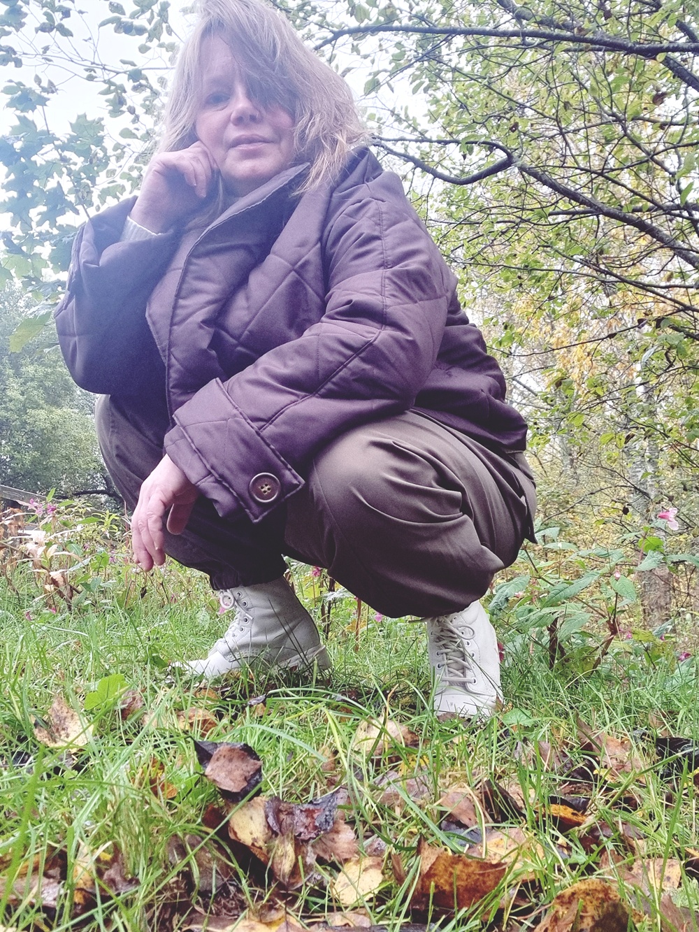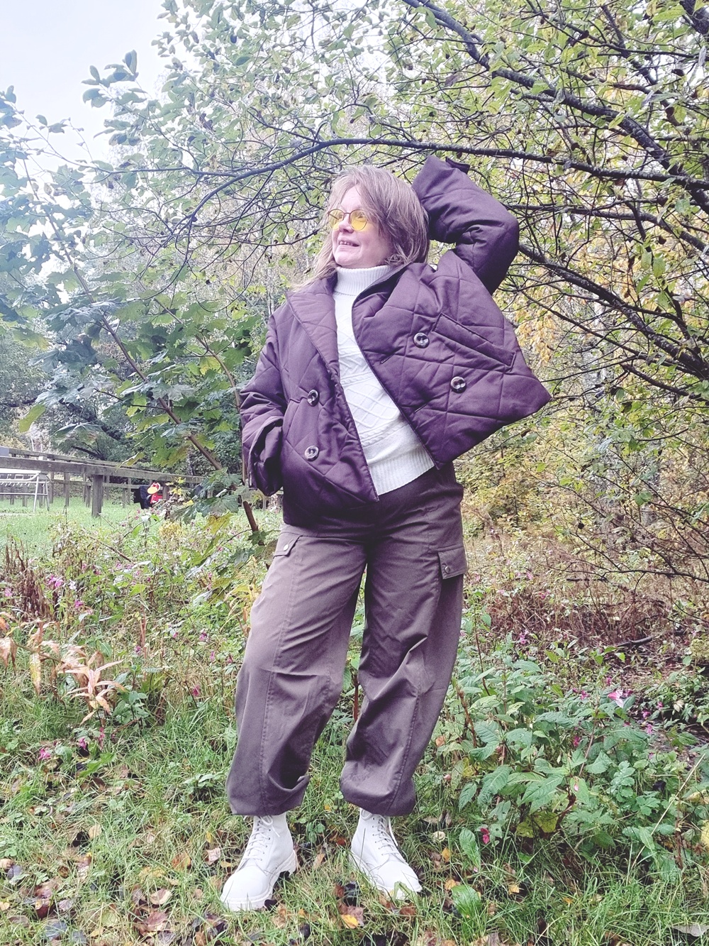 Jalkoihin laitan Dr. Martensit – kengät, jotka eivät pyydä lupaa keneltäkään. Ne ovat vahvat, painavat, kestävät ja klassiset. Ne ovat myös osa sitä tarinaa, jossa keski-ikäinen ei suostu katoamaan tai pehmentämään itseään miellyttääkseen yhteiskunnan käsityksiä “aikuiseen naiseen sopivasta” jalkineesta. Nämä maiharit kantavat minut töihin, ulos, sisään, metsään, kokoukseen ja puheluihin, joissa ei ole aikaa selittää kenellekään, miksi kuljen mutaisia polkuja pitkin. Ne vain toimivat ja se riittää.