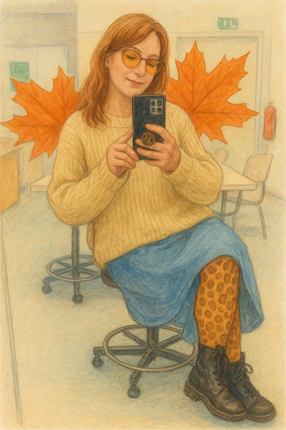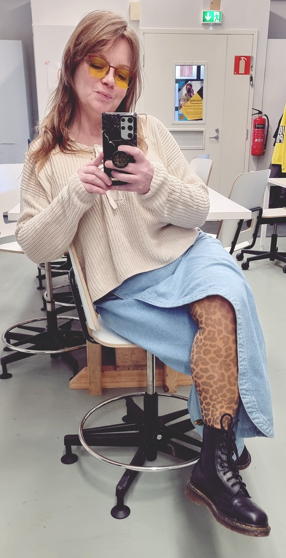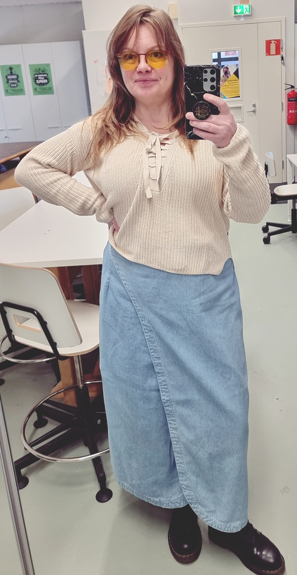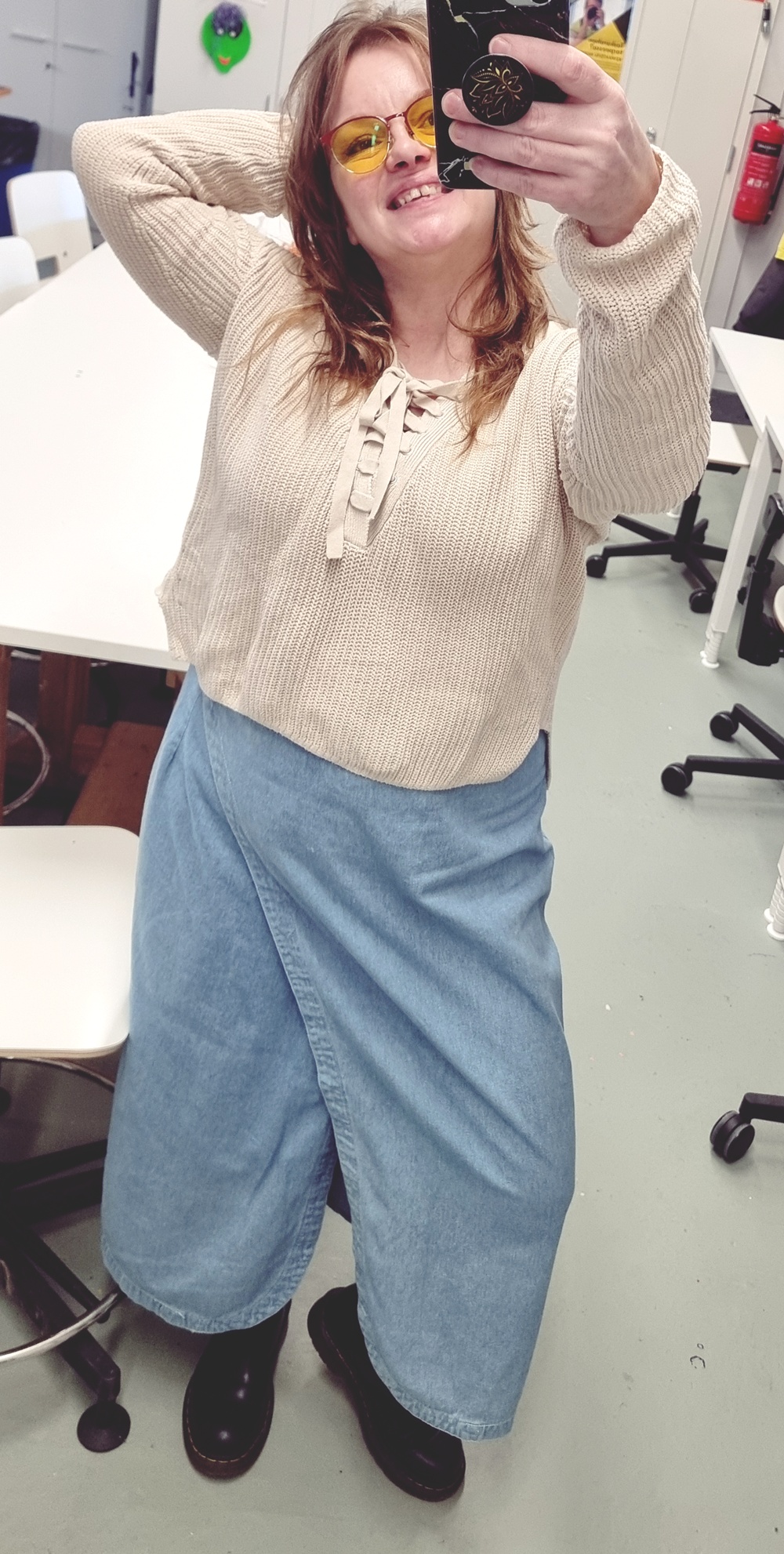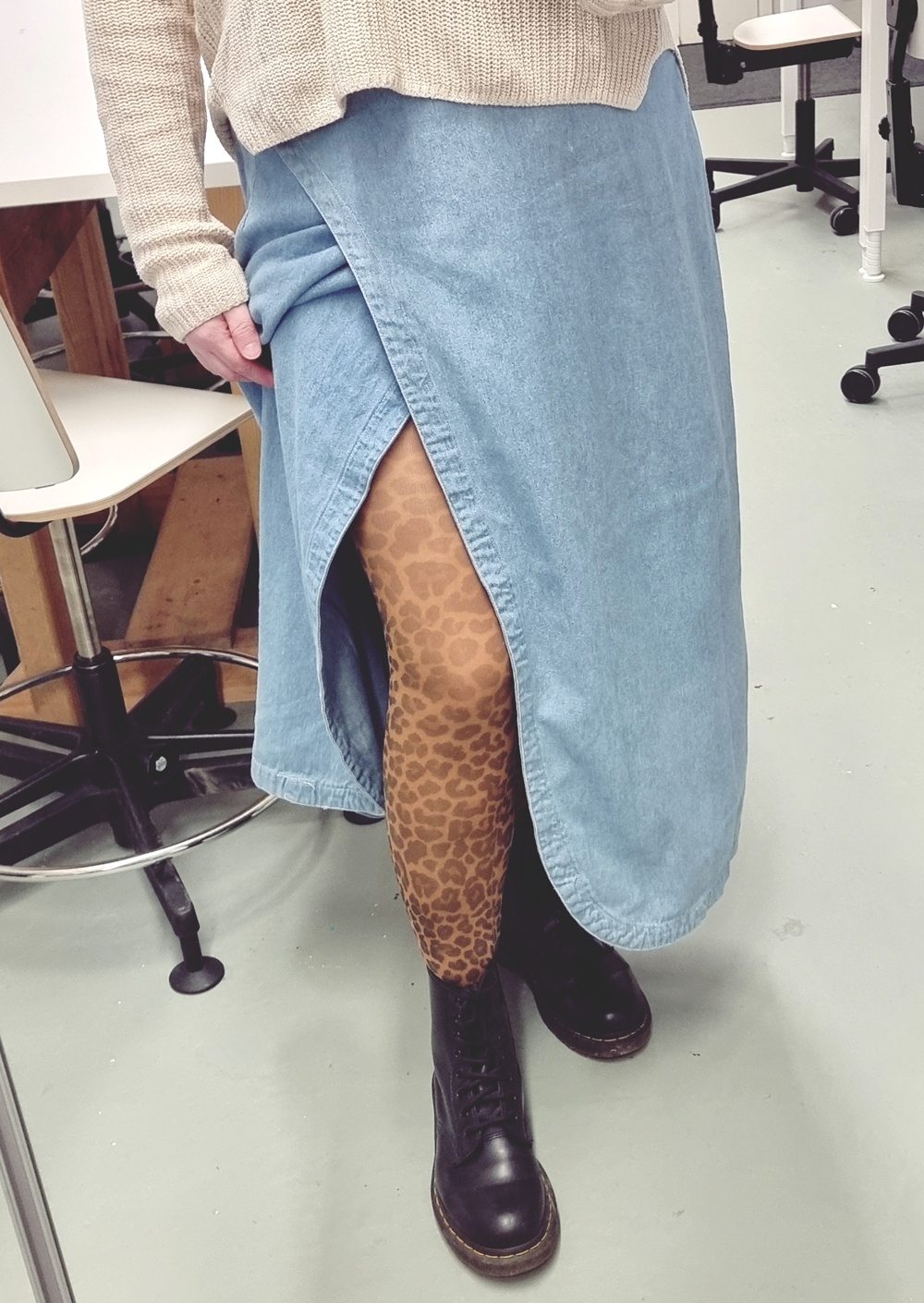 Tämä asu on minun tapani sanoa: en kutistu. En iän, normien tai odotusten edessä. Takki ommeltu itse rakkaudella. Housut löydetty vastuullisesti UFFista. Paita ostettu paikasta, jota en edes yritä puolustella. Ja kengät – Dr. Martens, ne nyt vain kuuluvat jalkaan. Tällä tavalla pukeudun töihin. Rohkeasti, rennosti ja täysin omannäköisesti.