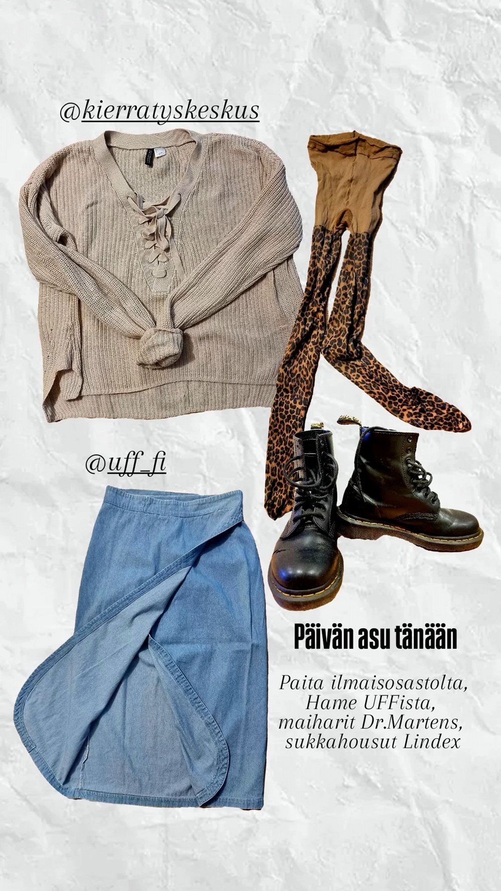 Tässä on jotain kiehtovan ristiriitaista: housut kierrätettynä UFFista, paita taas liikkeestä, joka on kaikkea muuta kuin ekologisen minimalismin ytimessä. Mutta ehkä juuri tämä on totta: me emme elä täydellisiä, oppikirjamaisen moraalisia vaate-elämiä. Me teemme valintoja, jotka toimivat arjessa.