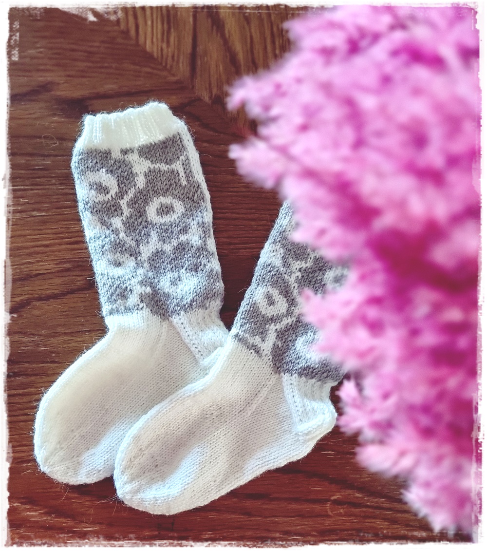 Näitä sukkia teinkin sitten vuoden, luulen, että nämä sukat ovat yksi syy sille, miksi minun lankatyöinto päättyi. Malli oli kauhea ja jouduin pakottaa itseni tekemään nämä sukat. Mitä sitä ei lapsensa eteen tekisi…