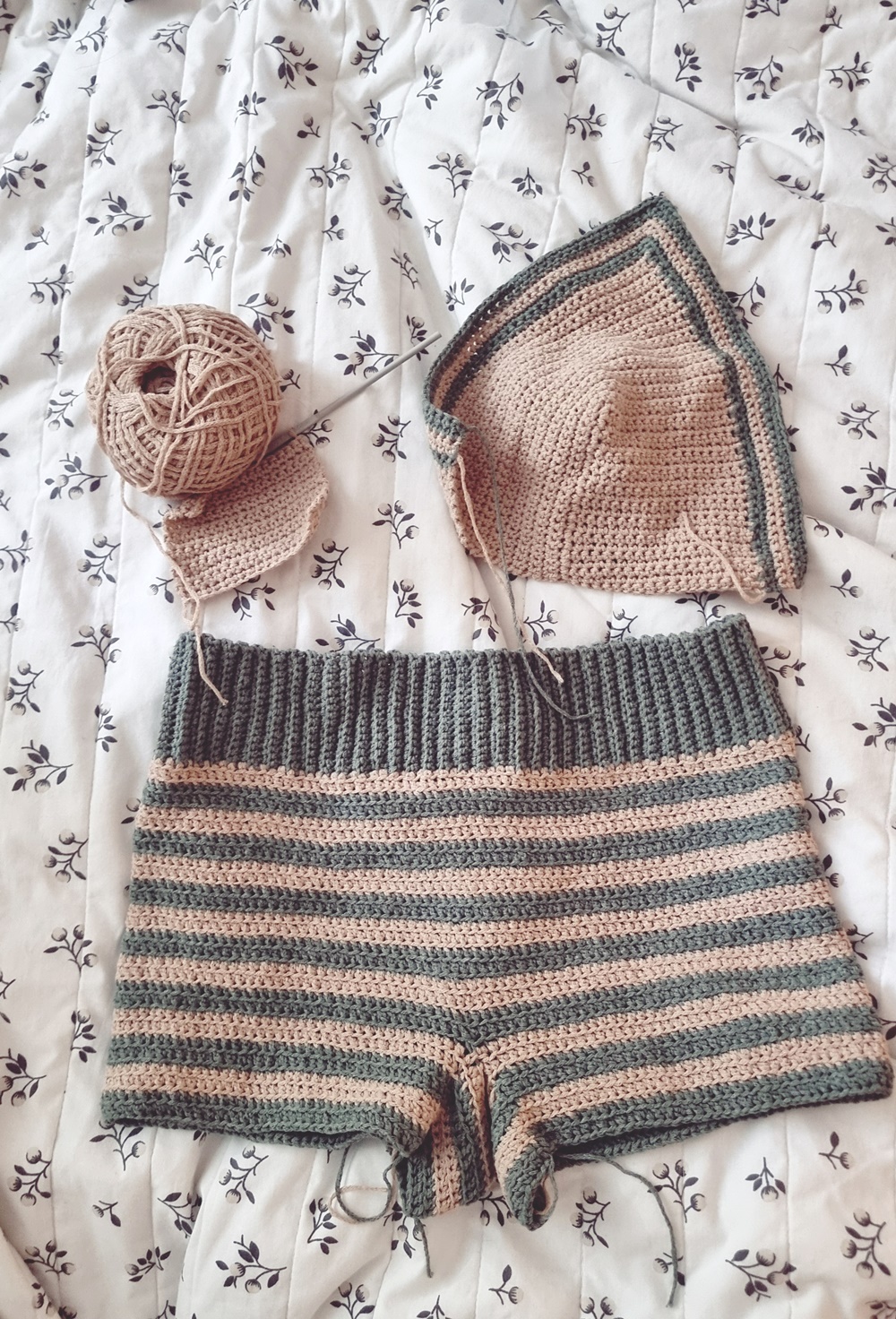 Tästä asusta tykkään todella paljon. Tosin molempiin shortseihin on tehtävä pieniä muutoksia. Tarkoitan siis ylempänä olevaan bikiniasuun sekä tähän. Eivät nuo housujen resoriosat toimi minulla ihan niin kuin pitäisi, joten tarvitsen kuminauhaa.