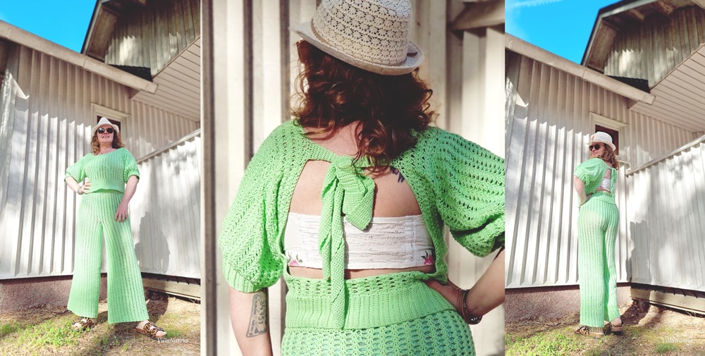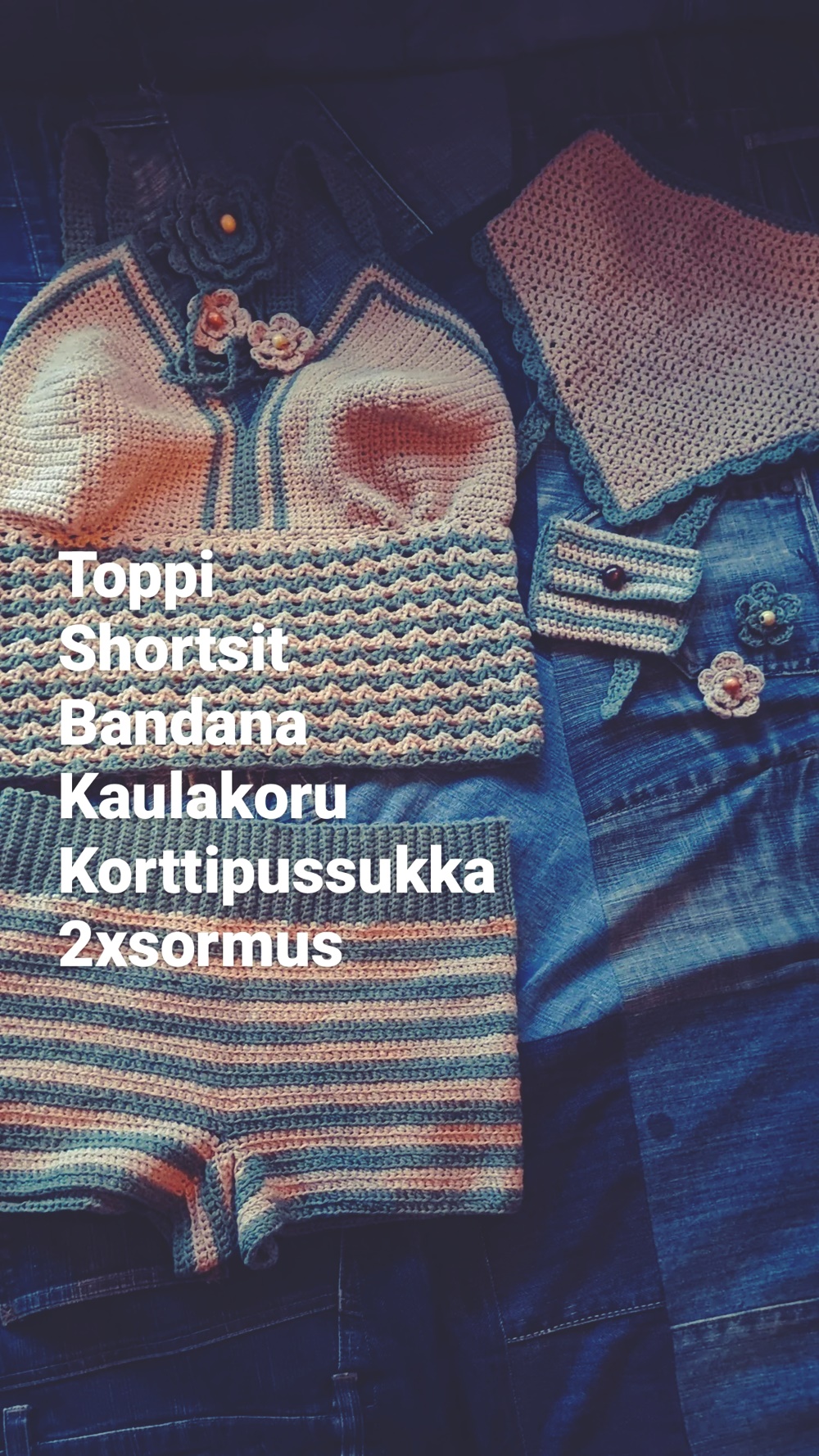 Tämä on kyllä oikeasti meikäläisen tyylinäyte, olen niin ylpeä tästä asusta ja mieli tekisi tehdä toinen samanmoinen eri langalla ensi kesänä. Mutta saa nyt katsoa. Mitään ohjetta ei näihin ole, kunhan testailin.