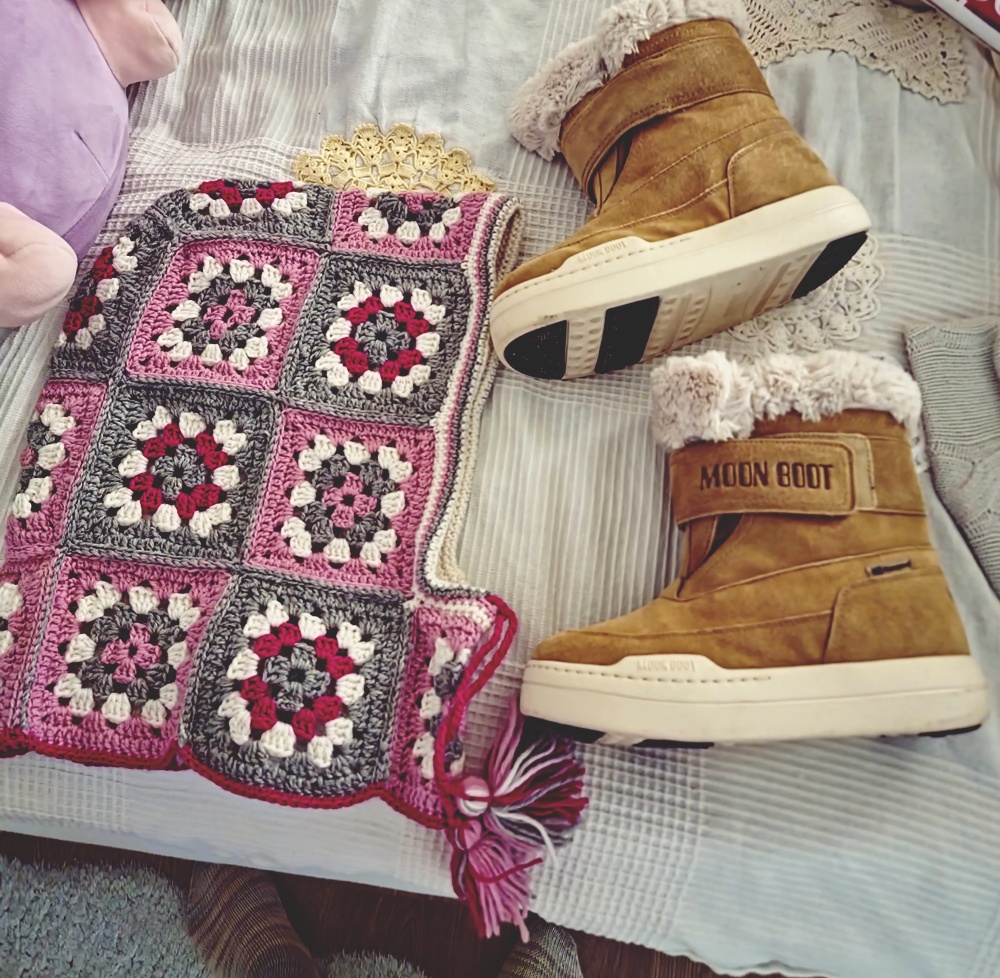 Asun ehkä seikkailullisin elementti on itse tehty isoäidinneliö balaclava. Se on kunnianosoitus käsityöperinteelle, mutta samalla moderni, jopa hieman kapinallinen. Balaclava ei ole vain asuste, se on kannanotto. Se kertoo, että lämpö ja tyyli eivät sulje toisiaan pois.