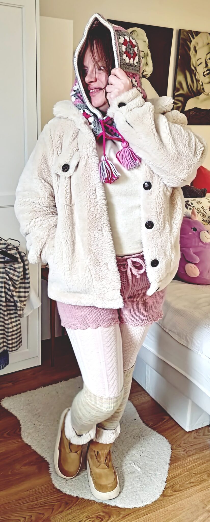 Keskeneräisyys ei ole virhe, vaan lähtökohta. Tässä asussa mikään ei syntynyt suorinta tietä valmiiksi, ja juuri siksi se tuntuu niin omalta. Villashortsit, jotka eivät alun perin olleet shortseja lainkaan, kirpparilöydöt, itse tehty balaclava ja talvinen kerrospukeutuminen muodostavat kokonaisuuden, jossa käsityö, kierrätys ja seikkailullinen tyyli kohtaavat. Tämä on tarina siitä, miten vaate voi muuttua, kun sille antaa luvan ja miten tyyli syntyy usein juuri siellä, missä suunnitelma päättyy.