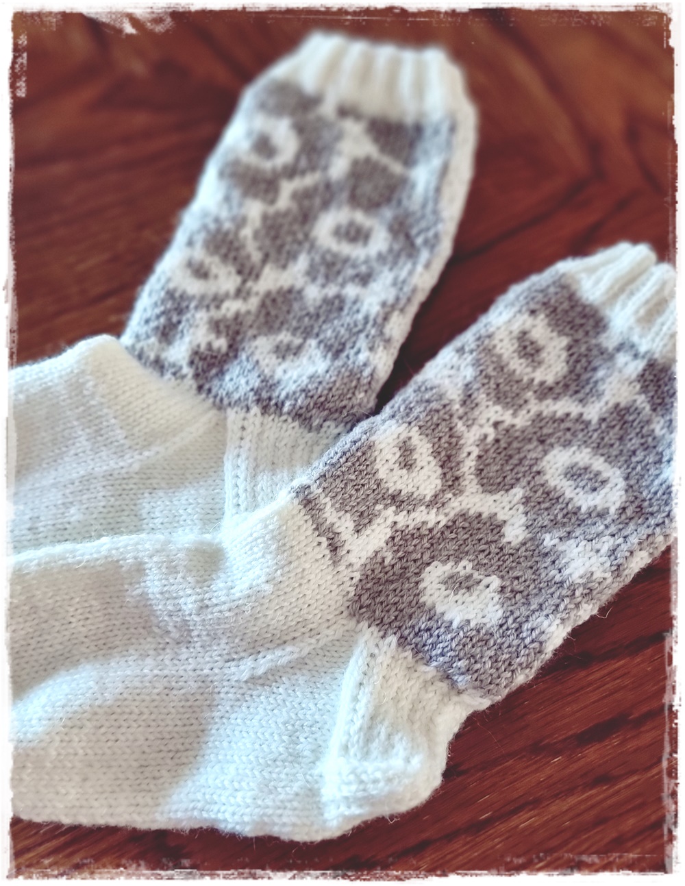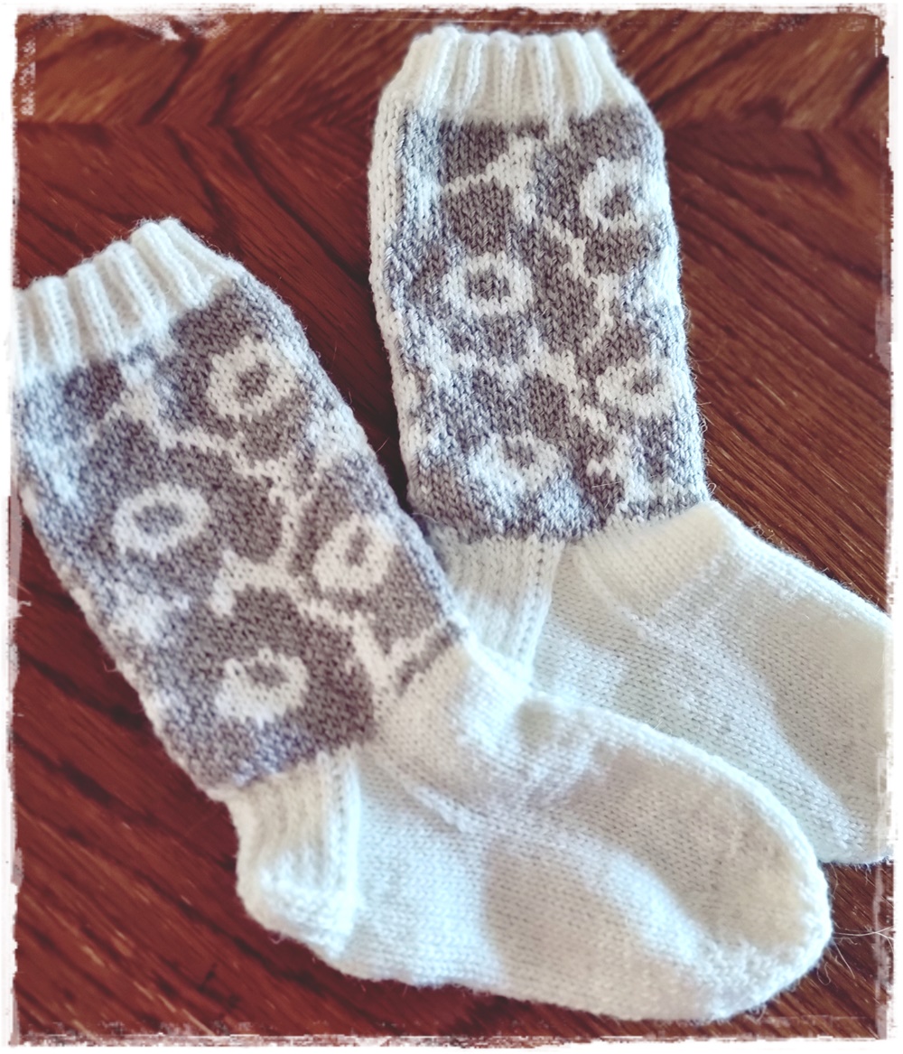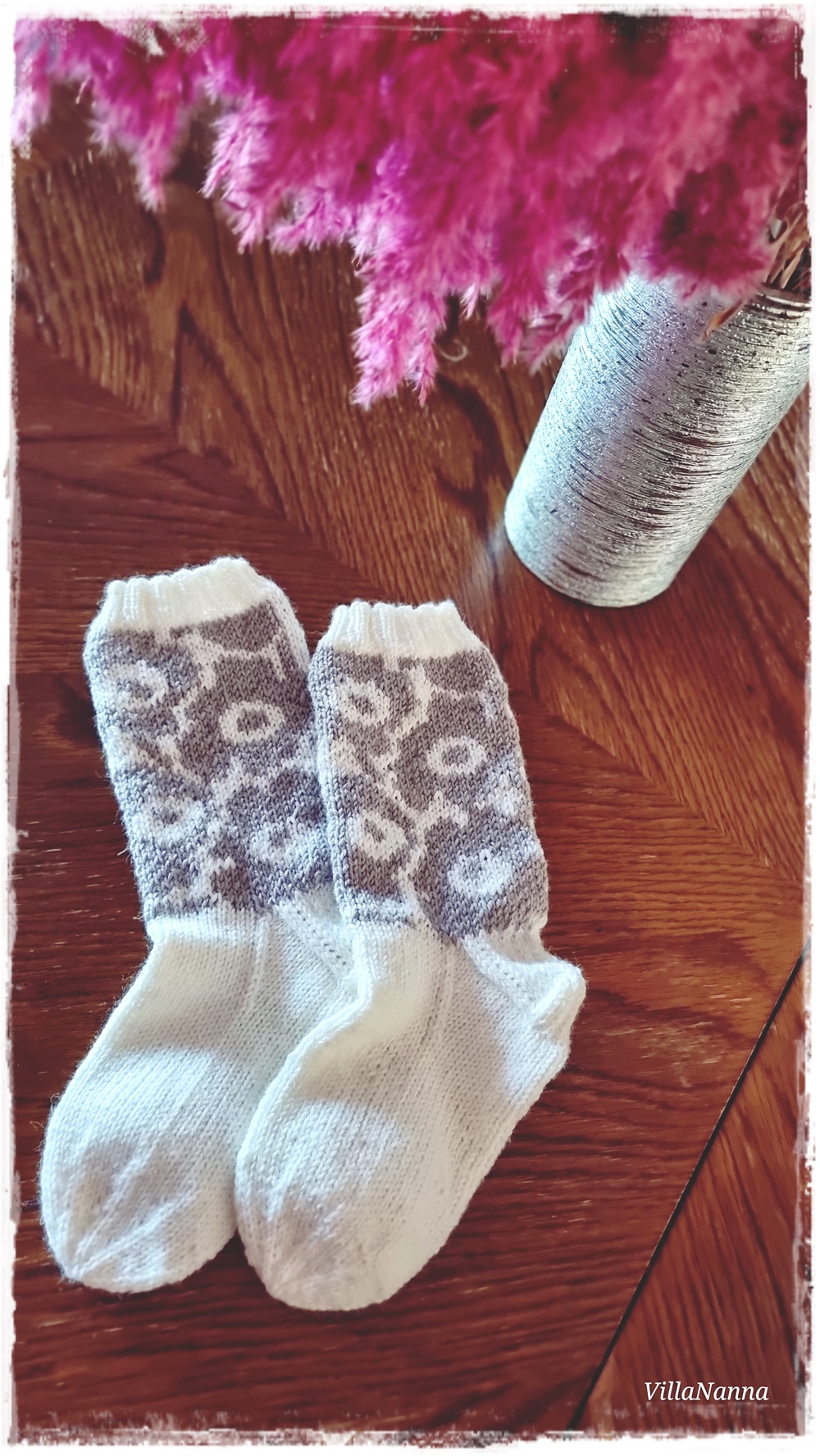 Tyttöni tosiaan todella tarkka vaatteistaan ja niinpä käsky kävi, että mitä väriä sukat saavat olla, valkoinen pohja beigeillä kuvioilla. Mallia etsin Pinterestistä ja lopulta piirsin kuviot paperille. Syy miksi näiden teko kesti niin kamalan kauan, johtuu siitä, etten tykännyt tehdä näitä. Rakkaudella tein, omalle pienelle nupulleni, mutta malli vaan ärsytti niin paljon, ettei hommasta tahtonut tulla mitään. Oli pakko pakottaa itsensä hommiin. Silloin kun neuloosia ei ole ja mitään kovin monimutkaista ei haluaisi tehdä, voi yksien sukkienkin tekoon vierähtää vuosi. Onhan minulla yhdet sukat kestäneet jo kolmisen vuotta valmistua. Mutta ne ovat omani.